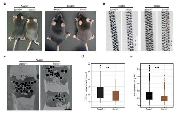 研究人员使用CRISPR-Cas9基因编辑技术在C57BL/6J品系小鼠中构建了同源区段敲除的小鼠模型,发现所有Bace2-/-小鼠的毛色浅于野生型毛色。 显微观察发现,相较于1月龄生长期,4月龄休止期的小鼠毛发中色素缺乏的情况更为显著。对小鼠背部毛发进行透射电镜观察并统计单个细胞内的黑素体数量和截面积,Bace2-/-小鼠出现与棕色大熊猫相似的黑素体数量显著减少和截面积显著减小的现象。