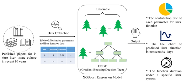 近年来,类器官、3D打印、器官芯片等技术快速发展,用于模拟器官结构及功能。以人工肝脏为例,研究者们通过以上方式构建了众多体外培养模型,累积了丰富实验数据。然而各研究间存在一定异质性,目前缺少人工肝脏功能数据的标准化、多手段对比及功能预测策略。本研究提取了近十年体外人工肝模型实验数据,比较了多个机器学习回归预测模型,剖析了基于2D、3D自组装(无材料)、3D支架(含材料)及芯片四种类型的人工肝脏功能,确定了各制造参数的重要程度,用于设计制造参数优化(Pre-design);揭示了制造参数对培养周期内人工肝白蛋白和尿素分泌能力的影响(Present);此外,该研究还预测了体外人工肝脏系统的功能维持能力 (Predict)。虽然符合筛选标准的数据有限,但该模型仍能较好地拟合现有实验结果,为评估人工肝脏功能提供了参考,也为其他类型器官的体外制造手段评估提供了借鉴。