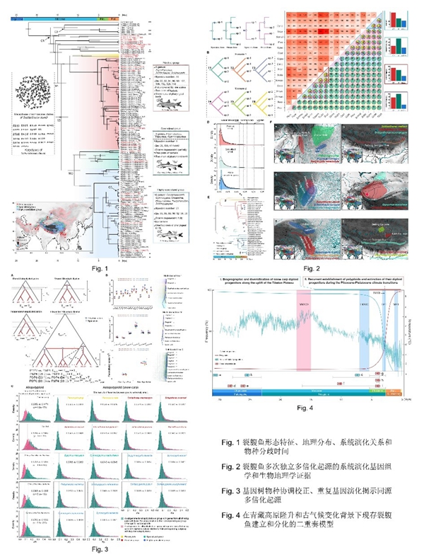 研究结果显示现存裂腹鱼在2.34至0.88百万年前经历了多次独立的多倍化起源,且可能均为同源多倍化,即物种分化后再独立多倍化是现存裂腹鱼多样性形成的主要模式。这与长久以来认为裂腹鱼是通过一次古老多倍化起源,即先多倍化后物种分化的假说截然不同。研究提出作为青藏高原隆升亲历者的现存裂腹鱼的生物多样性形成模式是一个二重奏:青藏高原的隆升促进了裂腹鱼二倍体祖先的广泛扩散和物种多样化,随后上新世-更新世的气候环境变化使得裂腹鱼二倍体祖先通过同源多倍化的方式得以适应生存,伴随着上新世-更新世的气候环境变化多倍体裂腹鱼逐渐取代其二倍体祖先。该研究不仅了刻画一个年轻多倍体脊椎动物谱系形成的过程,也为多倍化的适应性产生提供了证据。