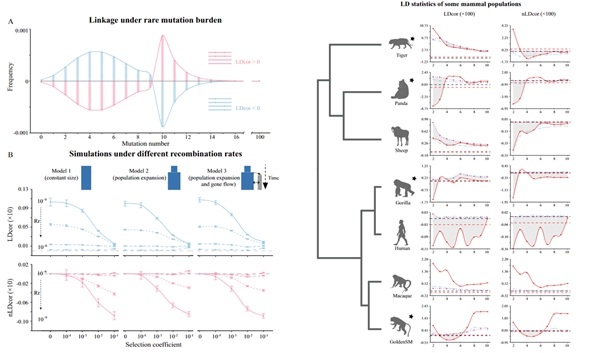 (2)发展一种新的动物遗传负荷指标:遗传多样性是生物多样性保护的核心内容之一。周旭明团队提出了一种新的统计指标(连锁负荷指标:LD和nLD),用以评估群体基因组水平的连锁不平衡。通过连锁负荷指标,研究者能够更为精确地衡量种群的遗传结构和生存潜力,从而支持跨物种比较。该研究通过大量的模拟验证,这个新指标可以有效体现不同演化作用的影响,它随着重组率、协同上位程度、以及bottleneck大小的增大而单调变化;这个新指标降低了数据类型要求,不依赖于单倍型信息,并且在三种历史模拟下,都与基于单倍型估计的经典指标保持了一致的规律;这个新指标还控制了不同频率的突变的变动范围,确保低频突变的信号不至于被较高频突变的信号覆盖,因而表现出较好的稳定性和可比性。这一创新性的指标不仅有助于评估物种的绝灭风险,还可以为确定保护行动的优先级提供重要参考依据。