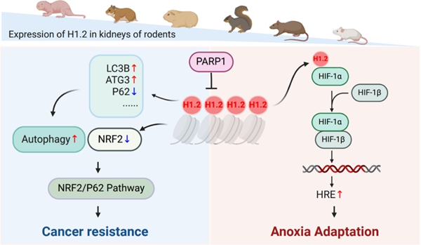 (3)发现裸鼹鼠缺氧适应和肿瘤抑制中双重作用因子:动物中一些特异性的表型固定与环境适应之间的关系尚不明确,例如寿命、肿瘤抗性、社会组织模式等表型对物种适合度的贡献难以度量。从跨物种的角度,也就是进化的尺度下,来比较不同物种的相关物种的遗传机制会带来一个理论上的困境,即相关表型的分子变异是否受到自选选择的作用。周旭明研究员团队通过对长寿啮齿动物裸鼹鼠和小鼠的胚胎成纤维细胞应对缺氧时差异表达基因进行时空表达组学分析,发现组蛋白H1.2(由HIST1H1C编码)在裸鼹鼠胚胎成纤维细胞(NEFs)和小鼠胚胎成纤维(MEFs)中为差异表达,且NEFs中较高的H1.2表达与其上游抑制基因PARP1的较低表达相关。进一步机制探究表明H1.2可以直接与HIF-1α PAS结构域相互作用,从而通过与HIF-1β的二聚化来促进HIF-1α的表达。此外,研究发现过表达H1.2通过NRF2/P62信号通路触发自噬并抑制癌细胞的迁移以及异种移植肿瘤的形成。最后,对H1.2敲入的转基因小鼠进行低氧胁迫生存实验发现其在低氧条件(4% O2)下生存时间显著延长且通过肿瘤移植实验发现其可以延缓肿瘤的形成。