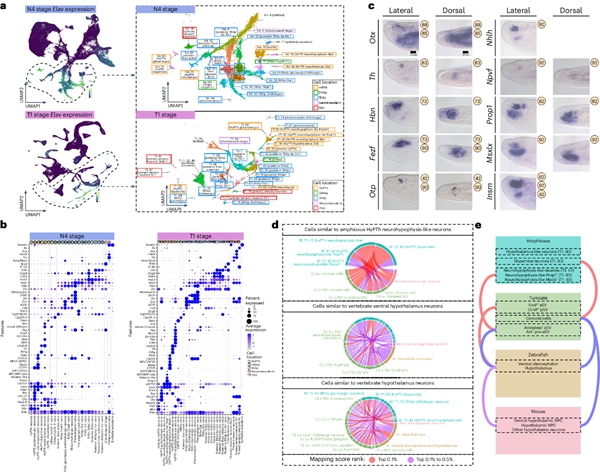 (4)揭示脊索动物神经系统的双端起源轨迹:脊椎动物拥有复杂的神经系统,目前,人们对脊椎动物神经细胞类型的演化以及无脊椎动物和脊椎动物之间中枢神经系统(CNS)发育的差异仍然了解甚少。中国科学院动物所周旭明研究员、厦门大学生命科学学院李光教授、和牛津大学生物系Sebastian Shimeld教授团队通过构建文昌鱼七个胚胎发育阶段的单细胞谱系,成功识别了一组神经垂体样神经元和下丘脑样神经元,推演了整个文昌鱼胚胎发育的细胞命运轨迹。研究人员利用CRISPR/Cas9、TALEN等基因编辑手段,针对性敲除了细胞命运轨迹预测出的不同转录因子基因,论证了利用生物信息学手段推算出的文昌鱼前、后端神经系统发育轨迹,为揭示脊椎动物神经系统的演化过程提供了清晰而直接的证据。该研究首先分析了小鼠、斑马鱼、海鞘、海胆和海葵等物种的胚胎单细胞数据,探究了脊椎动物神经系统的三种发育起源模式。然后重点比对了文昌鱼-斑马鱼细胞簇的相似性,其中SAMap算法将文昌鱼中枢神经系统前端祖细胞映射到斑马鱼中枢神经系统前端祖细胞,并且预测的后部祖细胞在物种之间对齐。为了进一步探究推演的中枢神经发育轨迹,团队利用CRISPR/Cas9基因敲除技术针对性敲除了文昌鱼细胞分化和中枢神经系统发育至关重要的几个转录因子基因。此外,研究人员在文昌鱼尾芽中发现了一组 NMP 细胞,它们共同表达脊椎动物 NMP 标记 SoxB1c 和 Bra2,并且研究人员观察到在 Brachyury 双敲除胚胎中,神经基因表达从后神经和神经中胚层细胞簇“溢出”到一般尾芽簇,支持 Brachyury 转录因子可能介导抑制文昌鱼神经基因表达,与 Brachyury 抑制脊椎动物神经标记基因表达的功能一致。