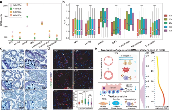 除了衰老本身,肥胖和生活方式也在睾丸衰老过程中发挥重要作用【4-6】。为此,研究人员结合机器学习和生物信息学手段,预测了衰老与肥胖协同作用的关键时间节点。结果显示,年龄超过45岁且BMI大于30的男性面临较高的不育风险。这一发现为理解男性生殖健康的维持及最佳生育年龄提供了新的视角。