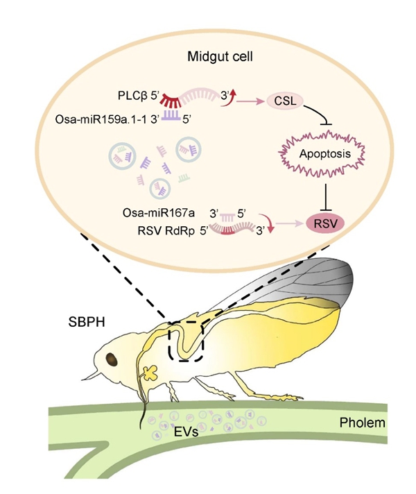 水稻条纹病毒(rice stripe virus,RSV)通过媒介昆虫灰飞虱以循回增殖的方式进行传播,导致严重的水稻条纹叶枯病,造成巨大的农业损失。崔峰研究团队前期研究发现,灰飞虱的唾液外泌体(EV的一种类型)在RSV突破唾液腺屏障实现从昆虫到植物的水平传播发挥重要作用(PNAS,2022)。然而,灰飞虱在取食水稻汁液的过程中,也会摄入大量植物EV,这些EV可能将水稻的小分子RNA传递至昆虫的消化道上皮细胞,进而对RSV在消化道细胞中的感染及其复制产生影响。崔峰研究组首次成功分离了水稻EV,鉴定出EV包裹的91个水稻miRNAs。其中两种高丰度的miRNAs,即Osa-miR159a.1-1和Osa-miR167a,可被EV转运至灰飞虱的中肠上皮细胞。Osa-miR159a.1-1通过与灰飞虱磷脂酶C(PLCβ)的5’UTR区结合增强其mRNA稳定性,从而上调PLCβ的表达,诱导下游基因CSL表达,抑制细胞凋亡促进RSV的复制。另一方面,Osa-miR167a则直接靶向RSV的聚合酶(RdRp)编码区,降低其表达抑制病毒的复制。两种水稻miRNAs协同调控了病毒在虫媒中的载量稳态。本研究不仅揭示了miRNAs作为一种效应因子在植物—病毒—虫媒传播链中的关键作用,还为开发控制病毒传播的新产品奠定了重要理论基础。