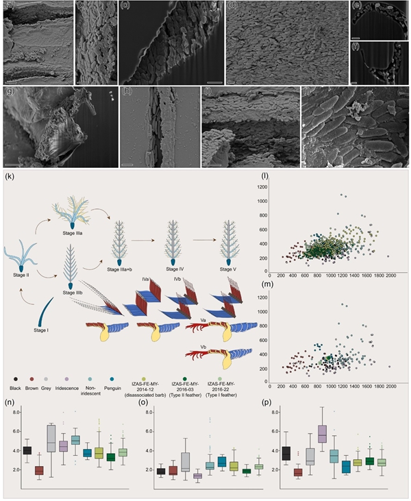 图2:羽毛化石的羽小枝中原位保存的黑素体(a-j),羽毛演化的修订模型(k)以及羽毛黑素体大小形状与其它颜色羽毛的的对比(l-p)。比例尺:(j) 0.3 μm;(f) 0.5 μm;(b),(c),(e)和(h) 1 μm;(i) 2 μm;(a)和(g) 4 μm;(d) 10 μm。