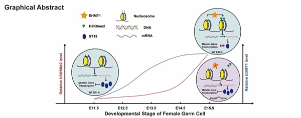 研究团队发现,在雌性生殖细胞发育过程中,H3K9me2修饰的动态重建对减数分裂的顺利进行至关重要。这一过程主要依赖于组蛋白甲基转移酶EHMT1的表达上调,其介导的H3K9me2修饰可有效抑制转录抑制因子ST18的表达。在EHMT1缺失小鼠中,H3K9me2重建失败导致ST18异常激活,进而抑制多个关键减数分裂基因(如Stra8、Sycp3、Dmc1等)的转录,最终引发减数分裂前期阻滞及生殖细胞凋亡。该研究揭示了H3K9me2(EHMT1)-ST18-Meiotic genes调控轴在减数分裂基因表达中的重要作用,为深入理解女性生殖细胞发育障碍的分子机制提供了新的研究方向,并为相关生殖疾病的临床干预策略提供了潜在靶点。