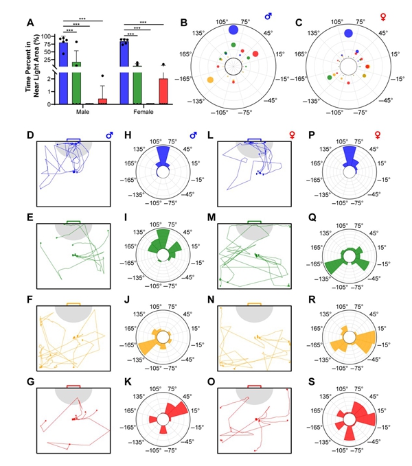 A:个体在近光区停留时间占比;B、C:雄性(B)与雌性(C)个体在测试场地中的角度分布;D-G:雄性个体在蓝光(D)、绿光(E)、黄光(F)、红光(G)条件下的运动轨迹;H-K:雄性个体在蓝光(H)、绿光(I)、黄光(J)、红光(K)条件下的角度分布;L-O:雌性个体在不同波长条件下的运动轨迹;P-S:雌性个体在不同波长条件下的角度分布。