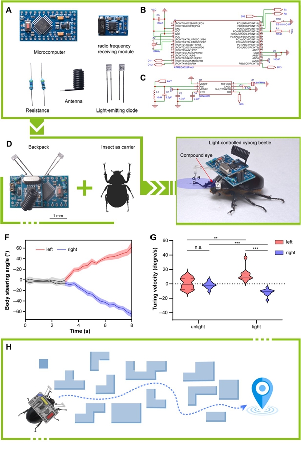 A:电子背包构成组件;B:控制芯片的最小系统原理图;C:射频模块原理图;D:组装完成的电子背包及载体昆虫;E:半机械昆虫;F:转向控制前后半机械昆虫的体轴偏转角度;G:转向控制前后半机械昆虫的转向角速度;H:光引导半机械昆虫的潜在应用示意图。