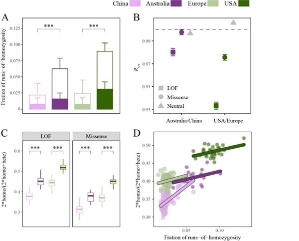 遗传结构分析证实了两次独立的引入历史。历史种群数量重建揭示,两个引入种群在约150-180年前均经历了极为严峻的瓶颈,并在基因组上留下深刻印记:全基因组多样性降至原生种群的50%-75%,近交水平显著升高,纯合有害突变负荷也随之增加。尽管选择性清除了部分有害等位基因,但仍未能完全抵消小种群遗传负荷的积累(图1&2)。