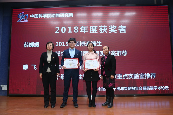 王艳芳常务副校长和动物研究所乔格侠副所长还为获得2018年度“秉志奖学金”的两名同学颁发了奖状。来自干细胞与生殖生物学国家重点实验室的腾飞同学和膜生物学国家重点实验室的薛媛媛同学,在经过了严格的评审之后,获得了此项殊荣。薛媛媛同学作为获奖学生代表进行了发言。