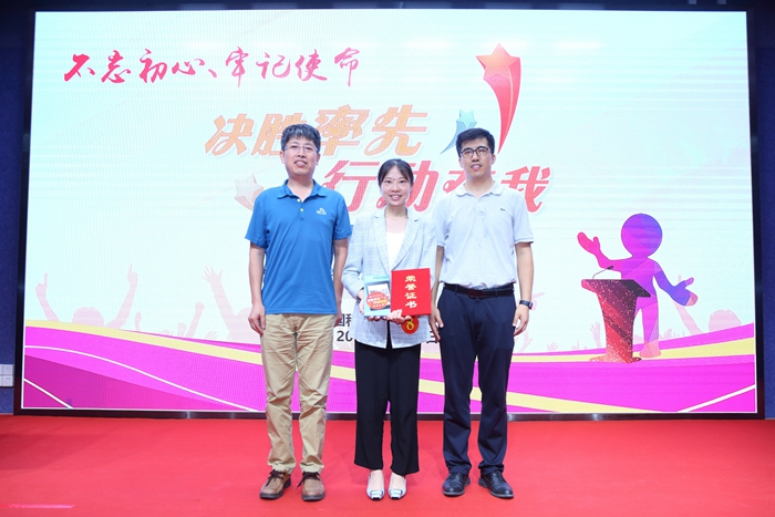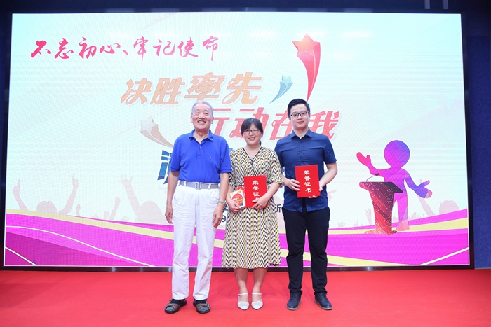 党委副书记、纪委书记杨俊成,党委办公室主任姜秉国为获得一等奖的选手颁奖