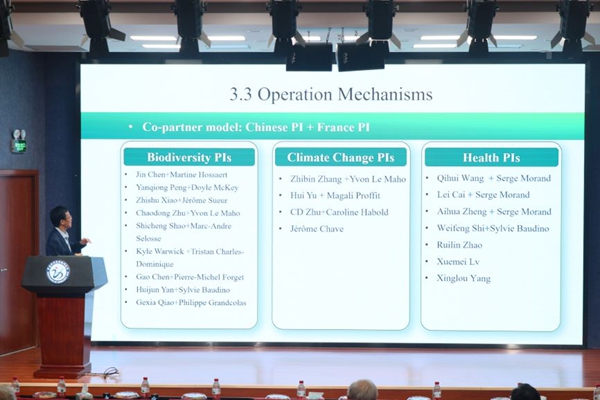 朱朝东执行主任介绍了该研究网络的成立背景、研究目的以及运行机制等,并指出了重点工作内容,包括中法双方轮流组织研讨会、夏季学校、实验技能课程、野外考察等。该研究网络期待经由中法两国科学家的共同努力,致力于解决:1)探究环境和气候变化,以及人类干扰对生物多样性丧失、生物入侵和疾病传播的影响和机制;2)提供保护生物多样性和减少生物灾害的解决方案;3)为《生物多样性公约》和《气候变化公约》提供科学专家支撑;4)推动和确保面向生物多样性挑战的公众教育和学生培训。