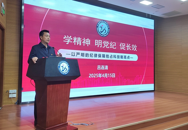 吕连清作了题为《学精神 明党纪 促长效——以严明的纪律保障抢占科技制高点》的报告。他指出,开展深入贯彻中央八项规定精神学习教育是党中央作出的重大决策,是巩固深化学习贯彻习近平新时代中国特色社会主义思想主题教育和党纪学习教育成果、纵深推进全面从严治党的重要举措,是研究所2025年度党建工作的重点任务;各基层党组织要按照学查改一体化推进要求,精心组织安排,不折不扣落实落地,以作风建设新成效推动党员干部进一步聚焦主责主业、强化使命担当。结合“深化党纪学习教育 严明岗位工作纪律”专项工作,吕连清深刻阐明了在抢占科技制高点背景下出台“三项制度”的重要意义,并强调研究所将进一步推动科研项目申报、人员兼职、岗位管理等制度的有效实施,切实将纪律要求转化为推动科研工作发展的有力保障,以严明纪律为抢占科技制高点保驾护航。