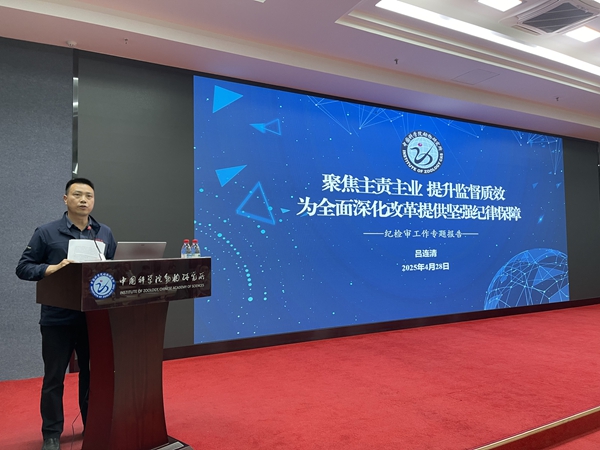 纪委书记吕连清作纪检审工作及警示教育专题报告,题为“聚焦主责主业 提升监督质效 为全面深化改革提供坚强纪律保障”。报告领学了习近平总书记在二十届中央纪委四次全会上发表的重要讲话精神,总结了研究所纪检审工作基本情况及近年取得的成效,介绍了研究所2025年纪检审工作重点;同时,强调了抓好项目申报管理、兼职管理、岗位管理“三项制度”贯彻落实的重要意义,并有针对性地通报了部分违反中央八项规定精神及“六大纪律”的典型案例。吕连清强调,无规矩不成方圆,党员干部要带头严格遵守“三项制度”,既做到严于律己,又要严负其责、严管所辖;要警钟长鸣,从典型问题、典型案例中吸取教训,用“身边事”教育“身边人”;要常怀敬畏之心,坚守廉洁底线,自觉做到知敬畏、存戒惧、守底线,以优良的作风学风推进研究所改革创新发展。
